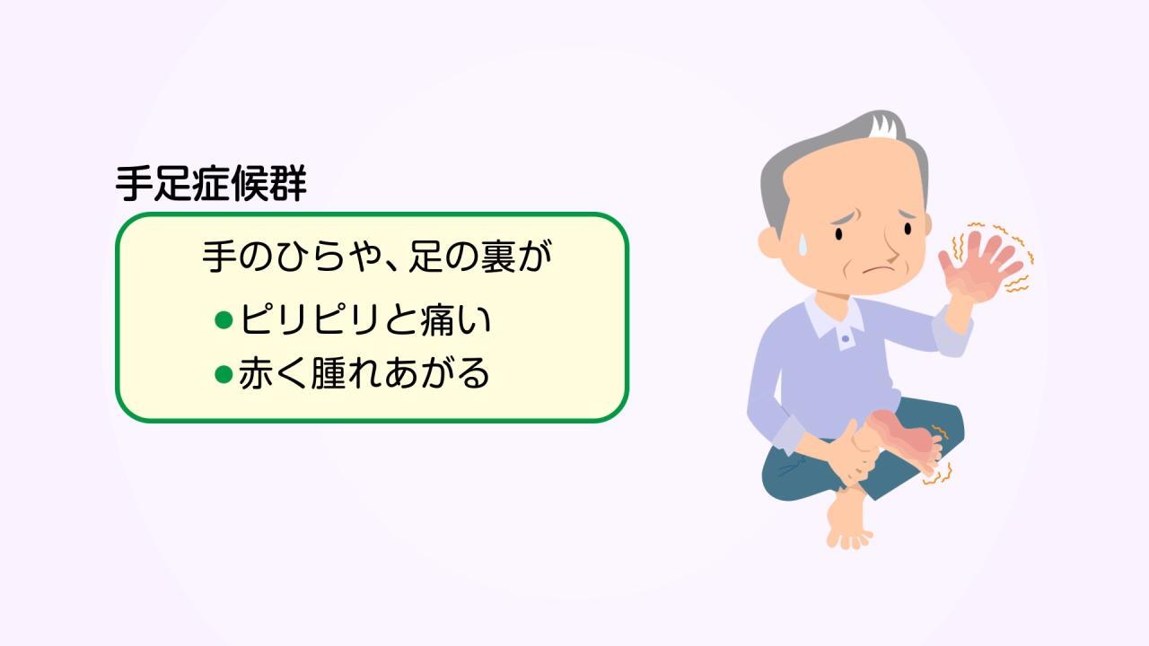 分子標的薬の副作用紹介動画(患者さん指導用) 2)手足症候群編 分子標的薬服用中におこりやすい副作用を予防したり、重症化を防ぐためのセルフケアについてまとめています。 患者さんの服薬指導にお役立てください。