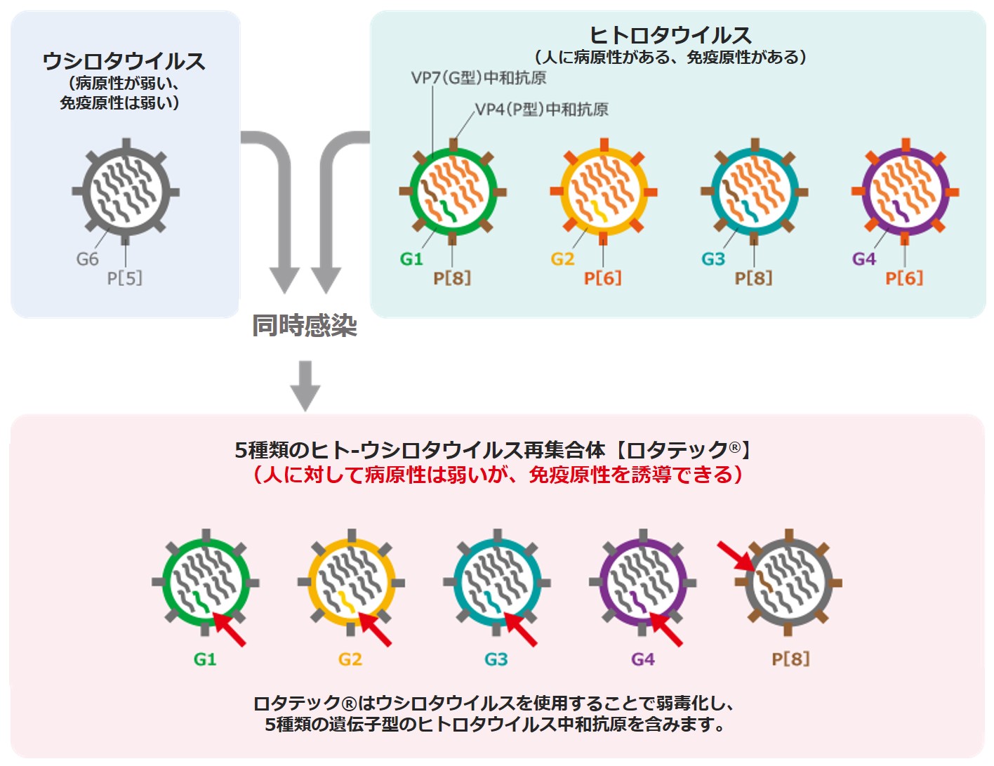ロタテック®はウシロタウイルスを親株として、ウイルス表面にあるVP4とVP7という中和抗体を誘導する外殻タンパク質をコードする遺伝子をヒトロタウイルスの遺伝子(VP4ではP[8]、VP7ではG1~G4)にそれぞれ置換した5種のウイルス株から製造したワクチンです。