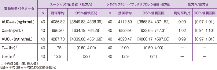 投与0時間から48時間後までの血漿中薬物濃度−時間曲線下面積(AUC0-48hr)および最高血漿中薬物濃度(Cmax)の幾何平均比(配合剤/単剤併用)[90%信頼区間]は、シタグリプチンでそれぞれ0.99[0.98, 1.00]および0.97[0.93,1.02]、イプラグリフロジンでそれぞれ0.99[0.97, 1.01]および1.02[0.94, 1.10]でした。