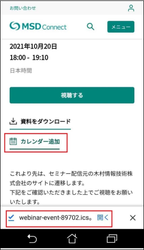 ②ダウンロードされたicsファイルの「開く」をタップします。(少しお時間がかかる場合がございます。)